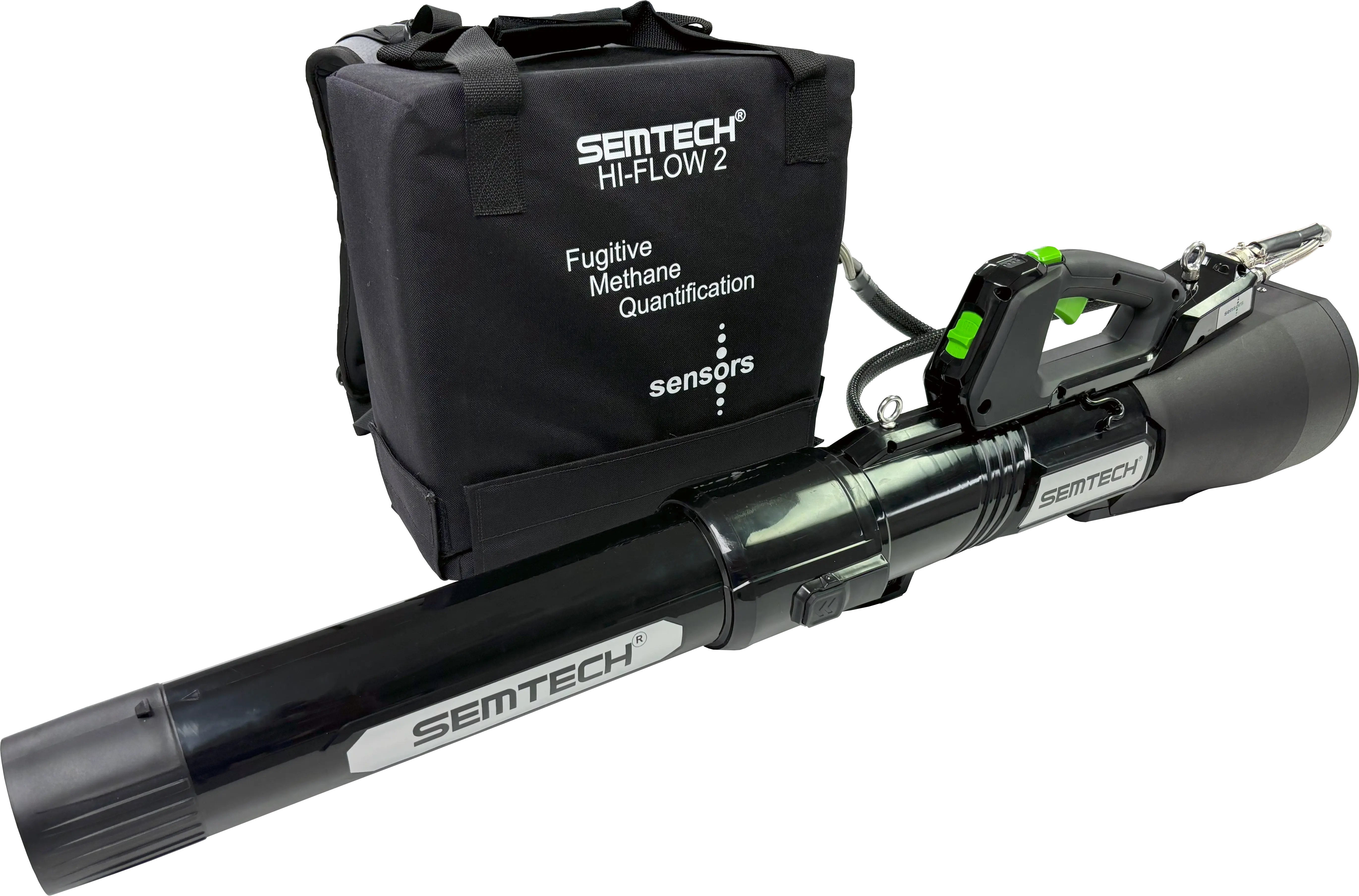 Our fugitive methane analyzer is the latest entry in Sensors Emissions Measurement Technology (SEMTECH) family. Sensors’ fugitive methane analyzer brings to bear our emission measurement experience into the oil and gas industry with a focus on leak detection and repair (LDAR). Sensors, Inc. is proud to present the latest in direct quantification of leaks in the 0.0005 to 25 CFM (0.015 to 700 lpm) range with accuracy better than 5%. This device uses state-of-the-art flow and gas sensing technologies that are integrated into a handheld unit for accurate measurement during established LDAR programs. Close – The SEMTECH® HI-FLOW 2 is a robust, portable, battery powered, high volume sampler for the accurate quantification of fugitive methane emissions, comprising: Sampler - Handheld device with a high-volume vacuum sampling fan and total flowrate monitor Analyzer - Portable control module (which can be carried, placed on the floor, or mounted to a backpack) housing the gas sensor technologies, control electronics, and battery pack The combination of these two components (with a variety of sampling adapters) allows the entire fugitive methane emission to be captured, diluted, and quantified accurately. HI-FLOW 2 utilizes state-of-the-art Tunable Diode Laser Absorption Spectroscopy (TDLAS) and a high-output fan which together facilitates 3-5x lower detection limit (0.0005 CFM) and a 3x increase in maximum leak rate (25 CFM) when compared to the historical Bacharach device. SEMTECH’s TDLAS tuned specifically to methane (unlike non-dispersive spectroscopy techniques) eliminates the known problems of interferences from other gases present in up, down and mid-stream. Moreover, our HI‑FLOW 2 addresses potential poisoning and saturation of nonoptical-based low-cost sensors.